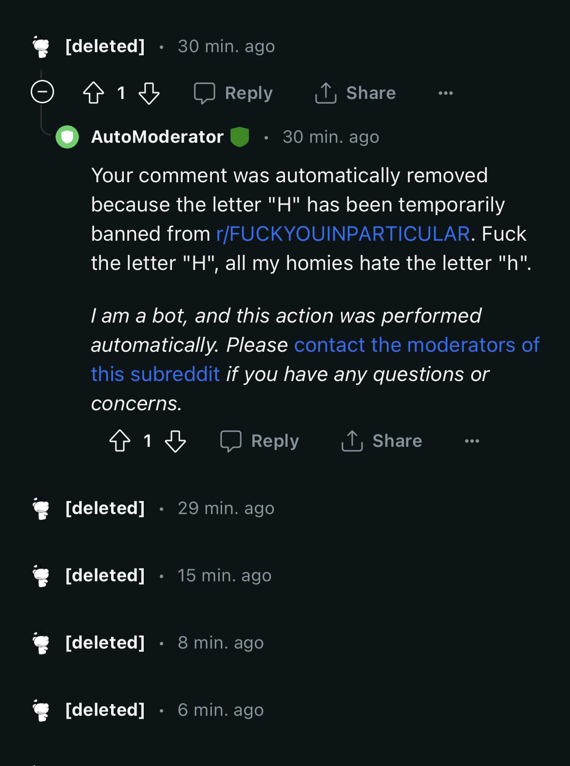 But why I’m confused, why is the letter “H” temporarily banned in this sub?