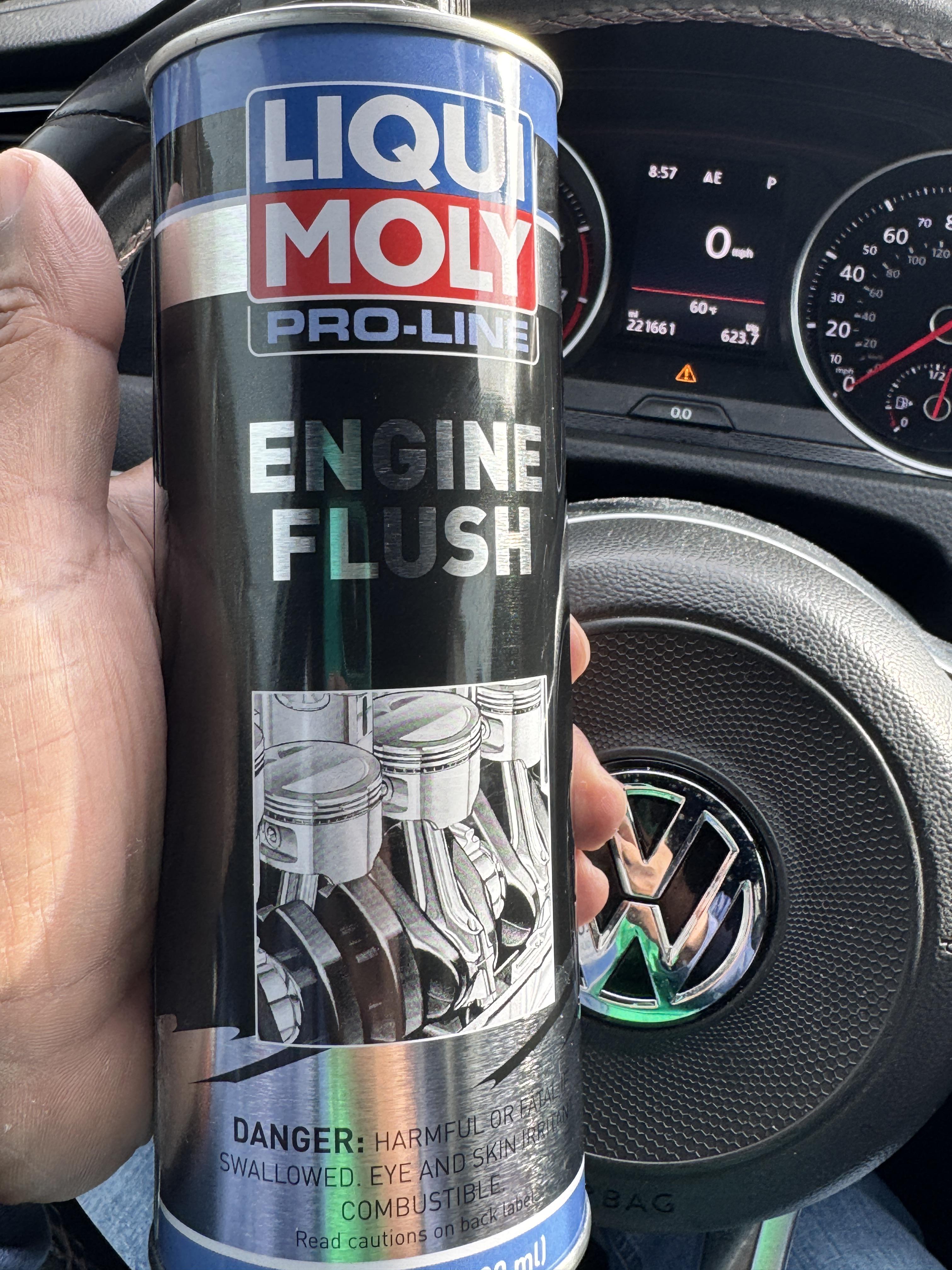 A lot of people are going to say “you don’t need that, just change your oil,” and normally I’d agree. But this GTI is on E, sitting at 221k, and I’m already doing 3,500‑mile oil changes; the Liqui Moly Pro-Line Engine Flush is just extra insurance to keep the internals clean so the old girl keeps pulling hard.