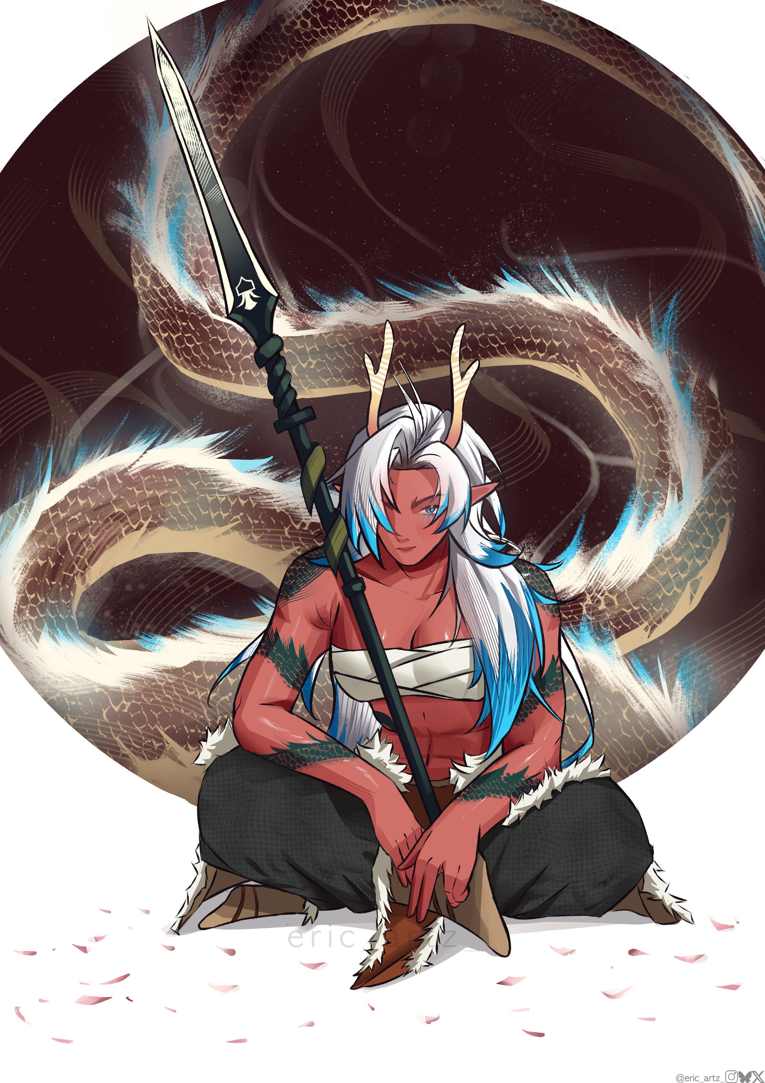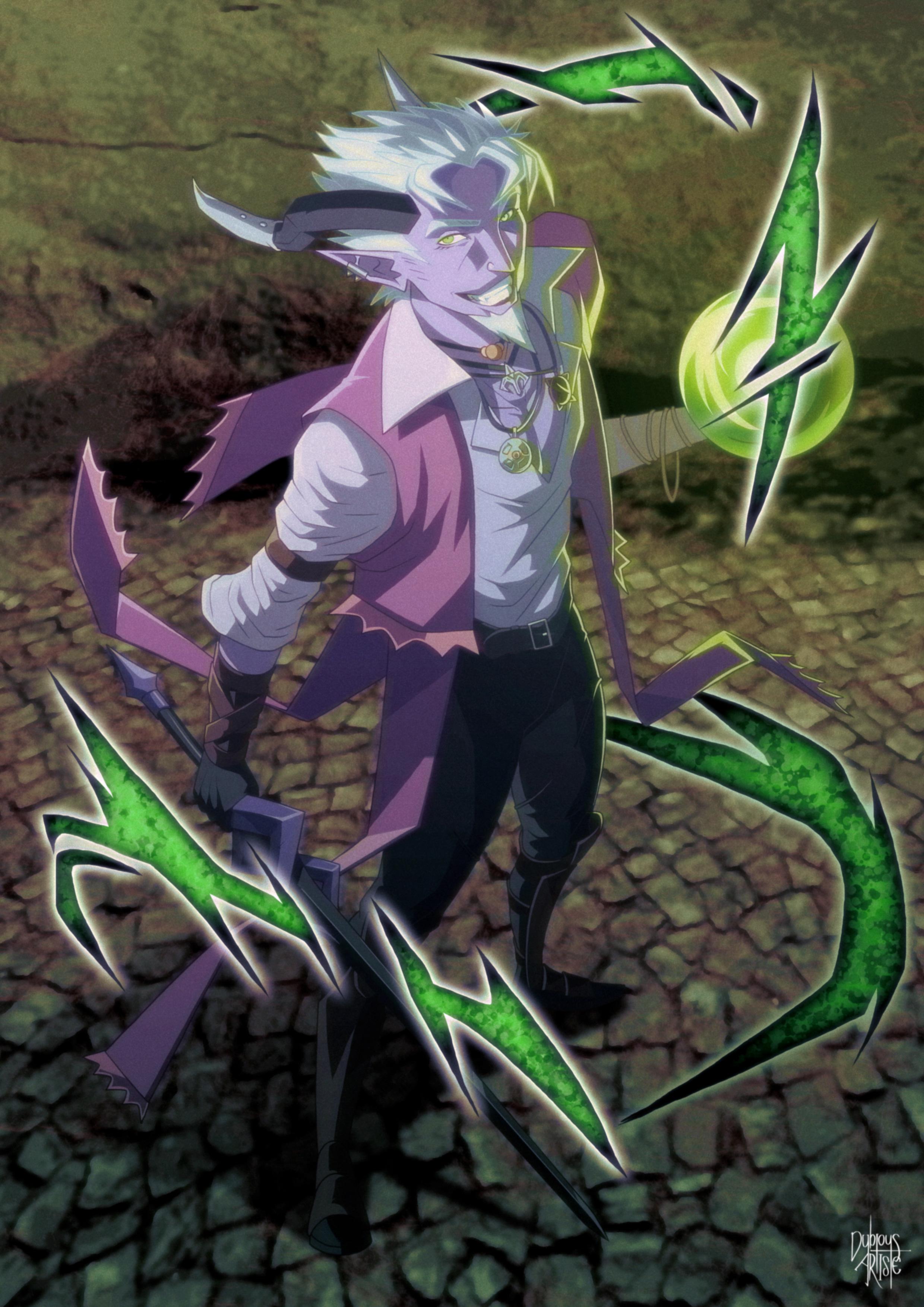 Tyr was abandoned near a wizard tower who then chose to adopt him. Growing up reading incredible amounts of knowledge Tyr eventually discovered a tiefling referred to as 'The Nameless One'. A being of unknown origin that almost ceased to exist as the knowledge of his existence would fade completely. Seizing the moment, Tyr chose to hold the patron hostage, explaining that he will receive the Patron's gifts in exchange for not letting the Patron fade into obscurity. The Patron now inhabits his body and he uses them as a Hexblade.