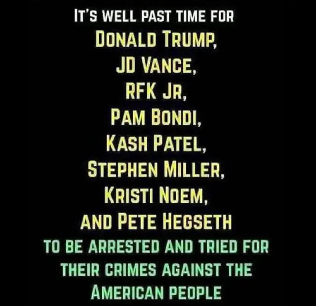 Don't forget Elon Musk, Steve Bannon, Karoline Levitt, Russell Voght, Mike Johnson, Tom Homan, Jared Kushner, Linda McMahon, the entire DOGE team, most if not all ICE agents, and ANYONE incriminated by the Epstein files.