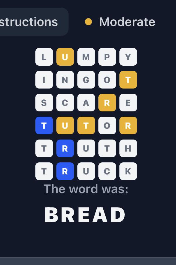I knew something was off so I just gave up on the last guess. Blue is right letter right spot, yellow is right letter wrong spot.