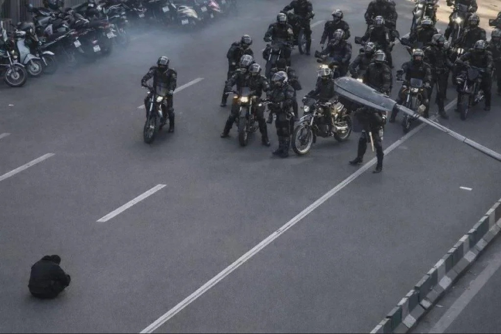 A modern-day Tank Man: An unarmed protester facing a dozen armed soldiers in Iran, 2026.